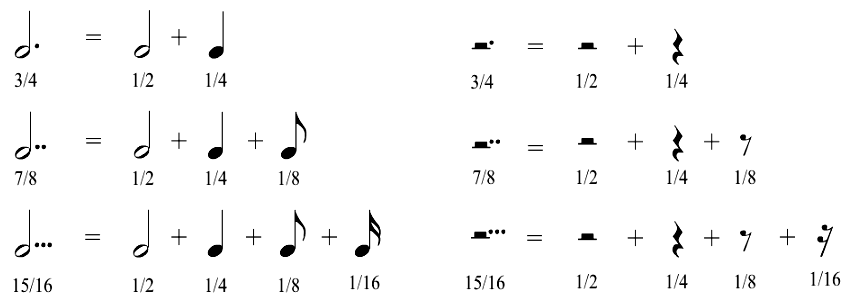 - 单独音符和单独休止符后面加附点