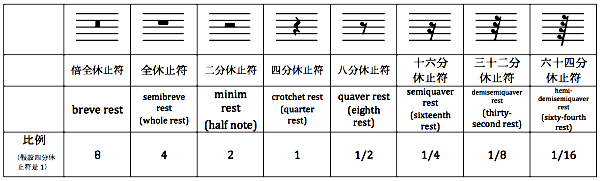 休止符命名和音符命名一致。全休止符表示整小节休止(4/2拍除外)。
