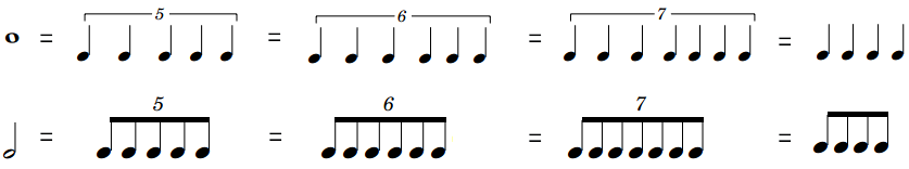 五连音、六连音、七连音代四,分别为每个音符原始时值的4/5、4/6、4/7。