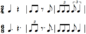 单拍子都可以转换为对应的复拍子,复拍子也都可转换为对应的单拍子。主要使用三种音符:附点、二连音、三连音。
