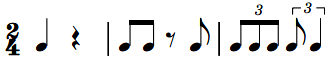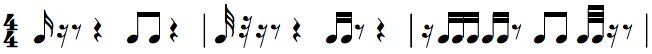 如下所示,每个单位拍中的休止符均不长于前一个音符的时值。三十二分音符后接的为三十二分休止符,此处三十二分休止符不可与后面的十六分休止符组合成附点十六分休止符。
