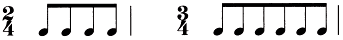1.在2/4、3/4中,如果整小节为八分音符,符尾可不分开。